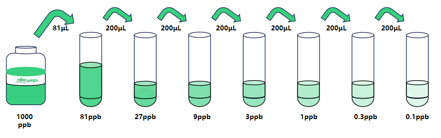 試劑盒中取出標準品,準備7個試管,先將1000ppb標準品(200µL)按需吸取一定量用1×稀釋液稀釋至81ppb(例:81µL的標準品母液+919µL的1×稀釋液,制備得到1000μL的81ppb濃度標準品),隨后在6個試管中分別加入400μL的1×稀釋液,在這6個單獨的試管中將81ppb標準品依次3倍倍比稀釋至7個梯度,共配制7個濃度的標準品,依次為:81ppb、27ppb、9ppb、3ppb、1ppb、0.3ppb、0.1ppb,從最高濃度標準品溶液中吸取200μL標準品到下一個試管中,輕輕吹打混勻,以此類推進行標準品的倍比稀釋(如圖所示),1×稀釋液用作零濃度標準品(0ppb)。